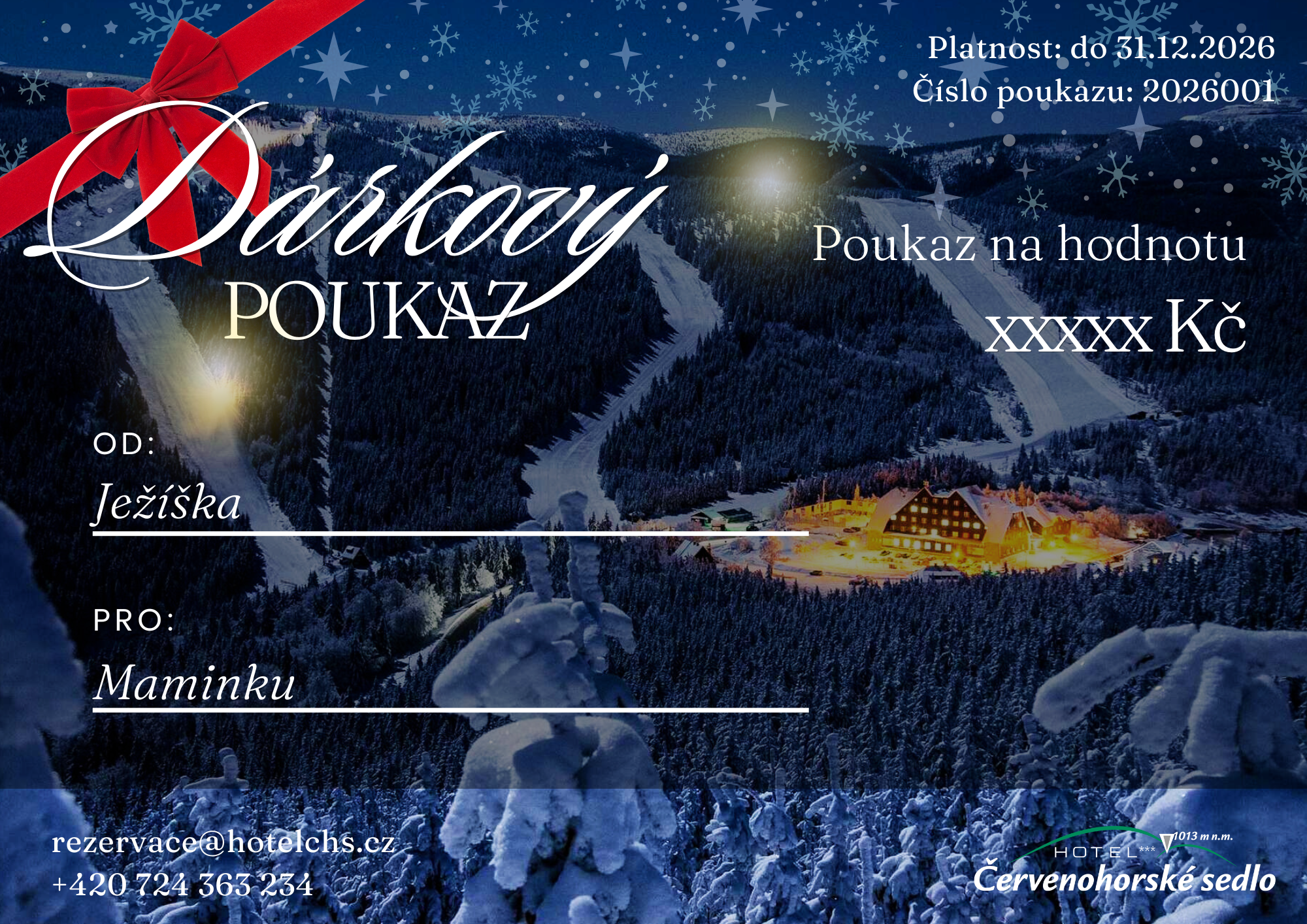Hledáte další vánoční dárek do sbírky? Darujte odpočinek a zábavu v srdci nádherné přírody Jeseníků na Červenohorském sedle! Připravili jsme pro vás speciální vánoční edici dárkových poukazů, které na přání doplníme o osobní věnování. Poukaz může být vystaven na libovolnou hodnotu a lze ho využít od 1.1.2026 až do konce roku. Pozor! Tyto exkluzivní poukazy můžete objednat pouze do 14. 12. 2025. Obdržíte je pohodlně e-mailem v tiskové podobě, takže si je můžete vytisknout podle svých představ. Máte zájem? Napište nám na rezervace@hotelchs.cz. Darujte pod stromeček příjemný zážitek, který potěší každého!