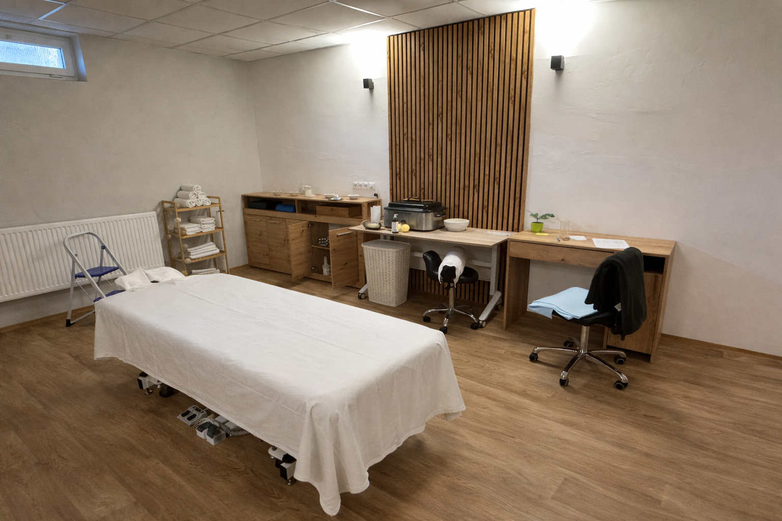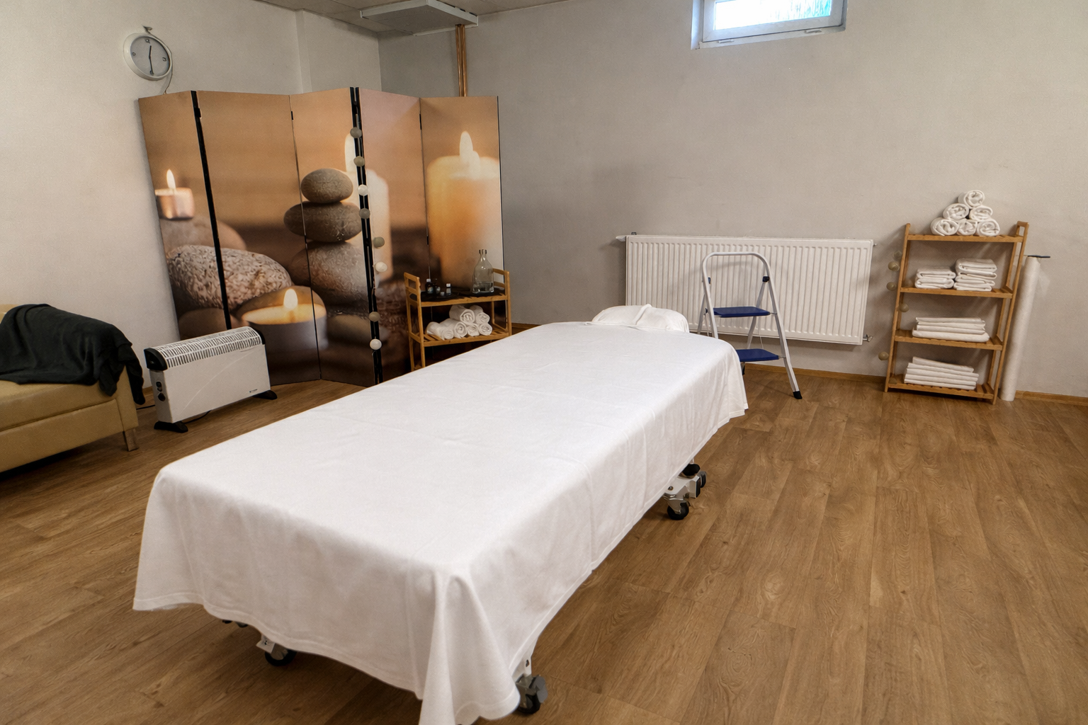 Nová masérna se nachází naproti výtahu, hned u wellness, takže pohodlí zůstává zachované – v papučkách až na masáž. Místnost je nově zrekonstruovaná, dostatečně prostorná a světlá a nechybí ani okno.