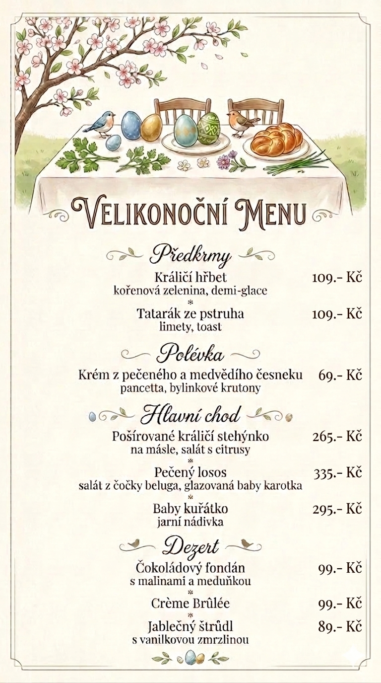 Nabídku v naší restauraci jsme navíc doplnili o speciální velikonoční menu, které bude po celé velikonoční svátky k dispozici. Těšit se můžete na sezónní speciality i sladké velikonoční dezerty.